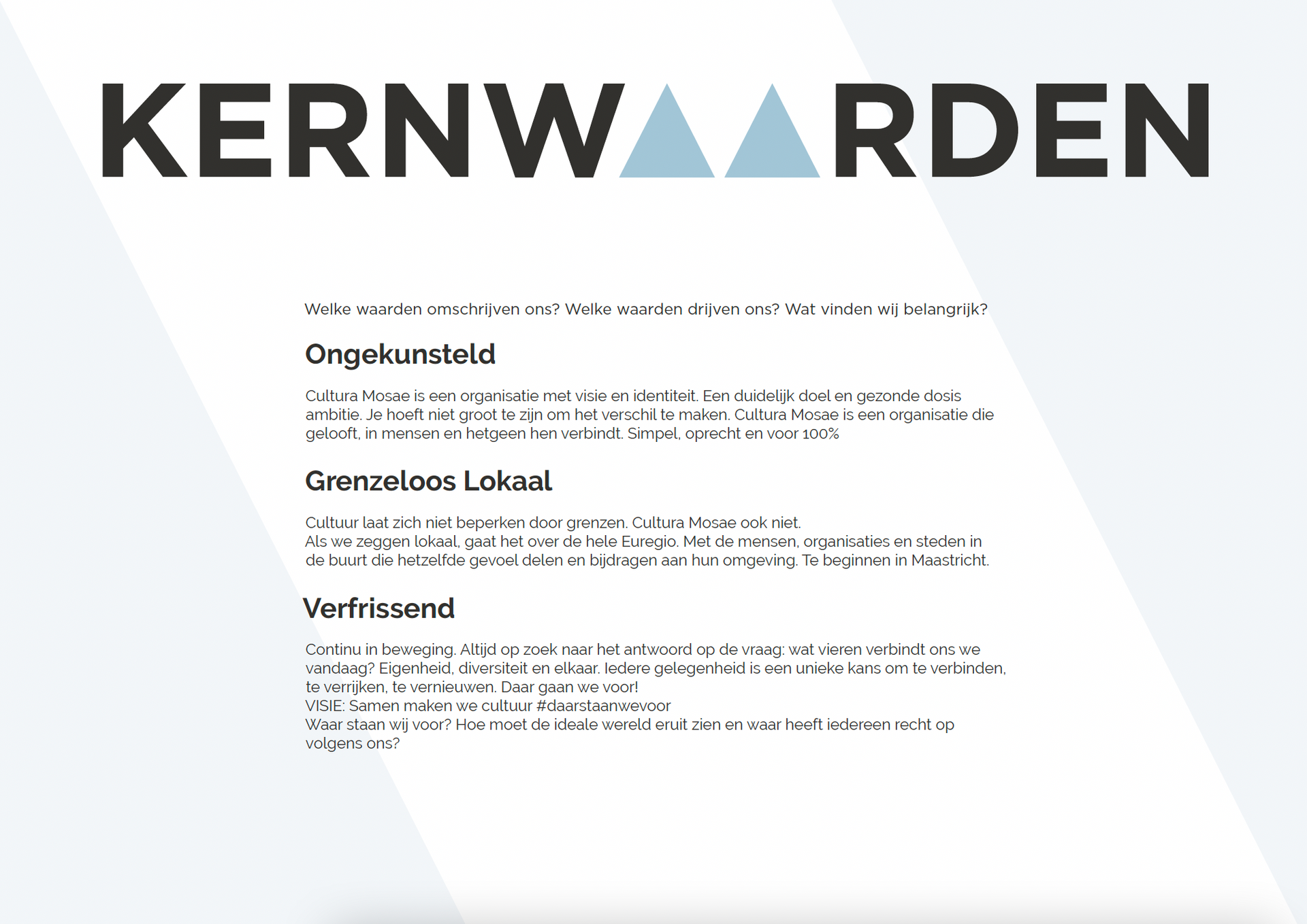 Cultura Mosae is een organisatie met visie en identiteit. Een duidelijk doel en gezonde dosis ambitie. Je hoeft niet groot te zijn om het verschil te maken. Cultura Mosae is een organisatie die gelooft, in mensen en hetgeen hen verbindt. Simpel, oprecht en voor 100%