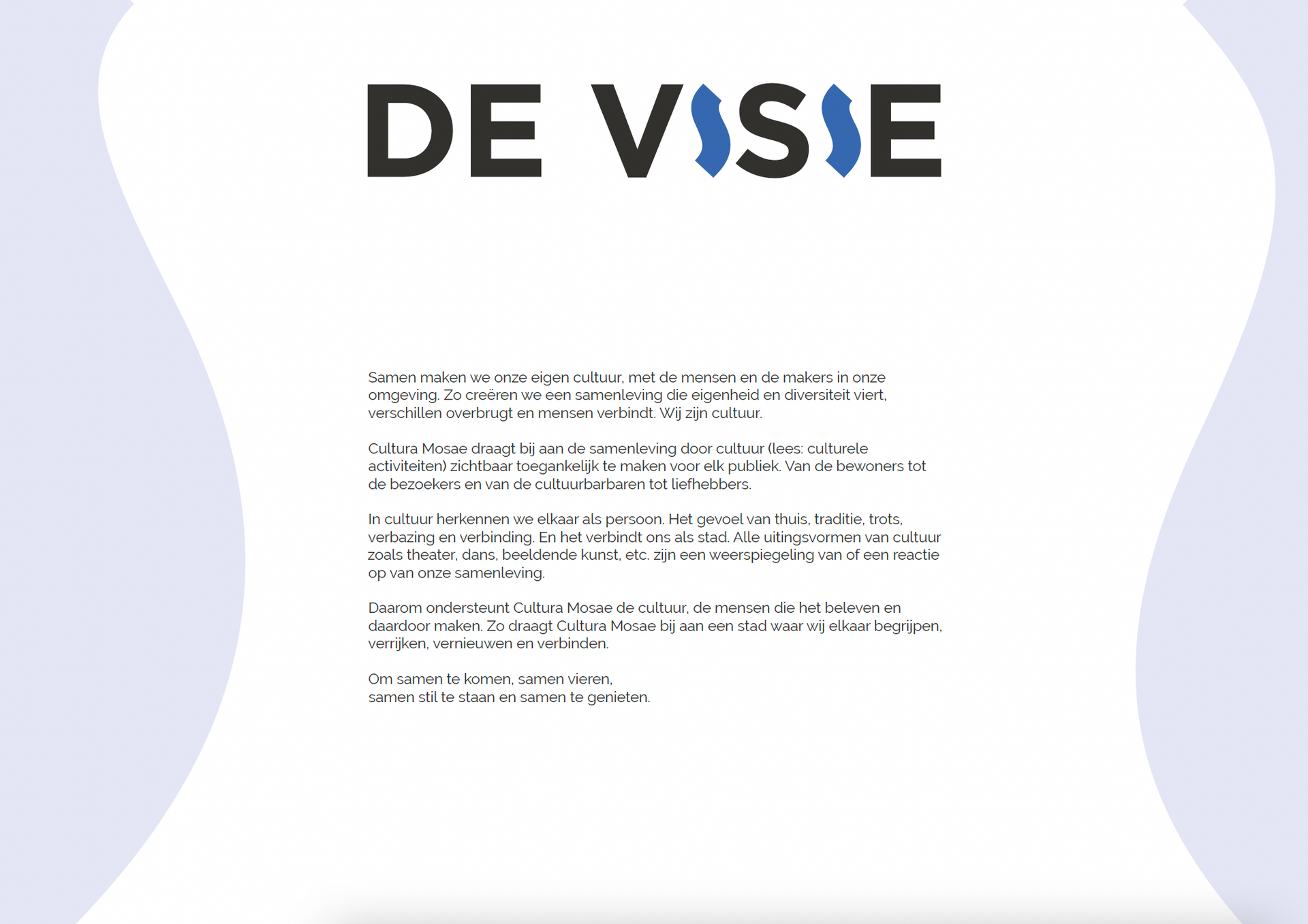 Samen maken we onze eigen cultuur, met de mensen en de makers in onze omgeving. Zo creëren we een samenleving die eigenheid en diversiteit viert, verschillen overbrugt en mensen verbindt. Wij zijn cultuur.