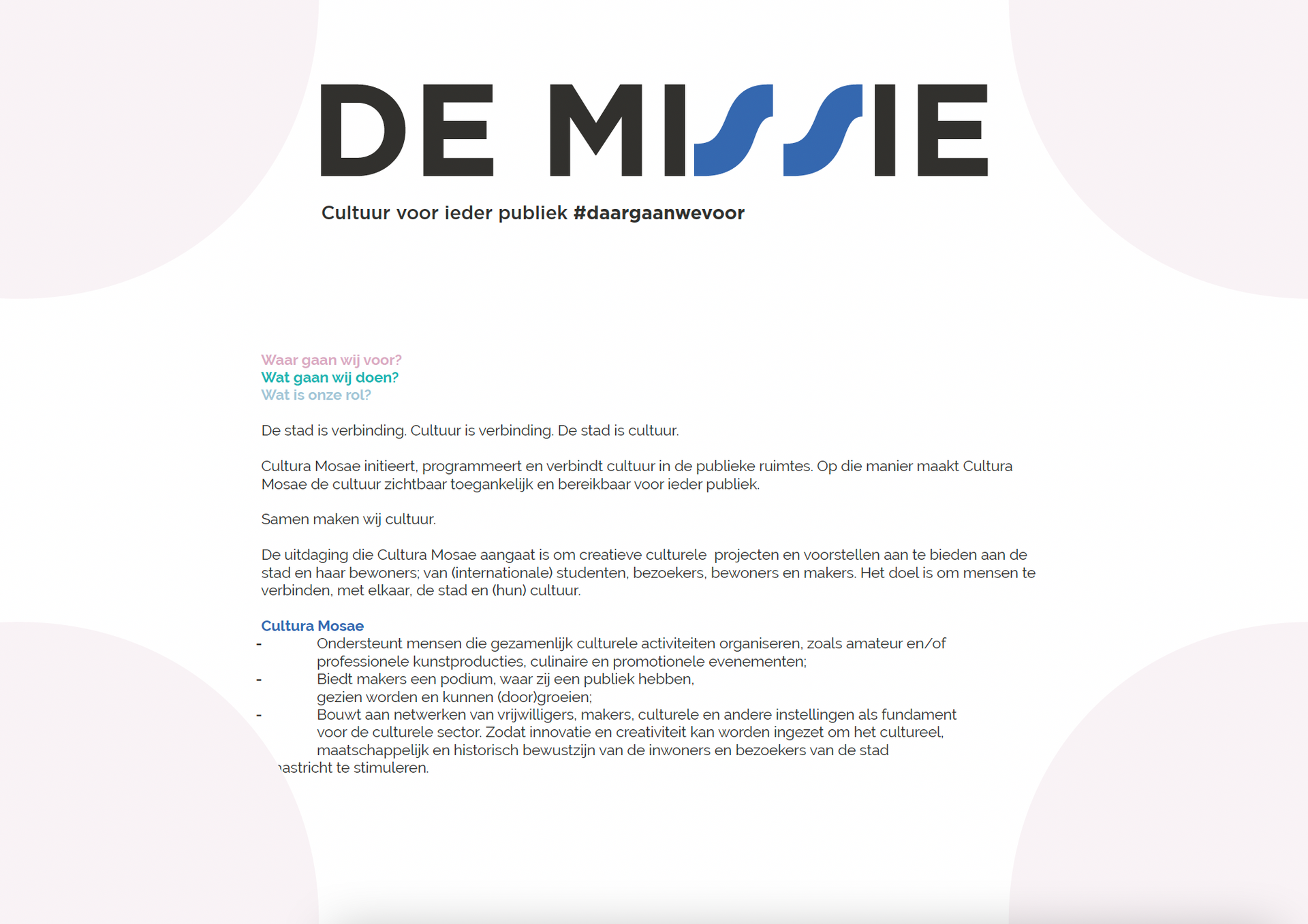 Daarom ondersteunt Cultura Mosae de cultuur, de mensen die het beleven en daardoor maken. Zo draagt Cultura Mosae bij aan een stad waar wij elkaar begrijpen, verrijken, vernieuwen en verbinden.